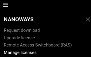 Once activation is confirmed, you will be redirected to Nanoways.com. Log in with your new credentials, then expand the menu panel on the left side and choose the entry Manage licenses.
